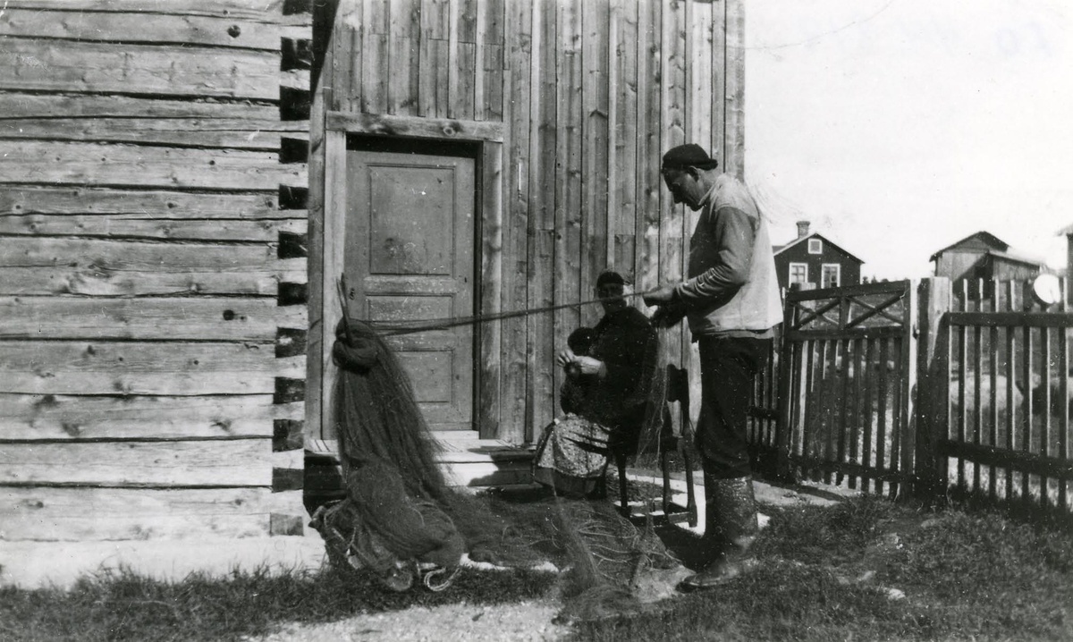 Ångermanland, Trysunda. Byggning av skötar i solen utanför stugknuten.