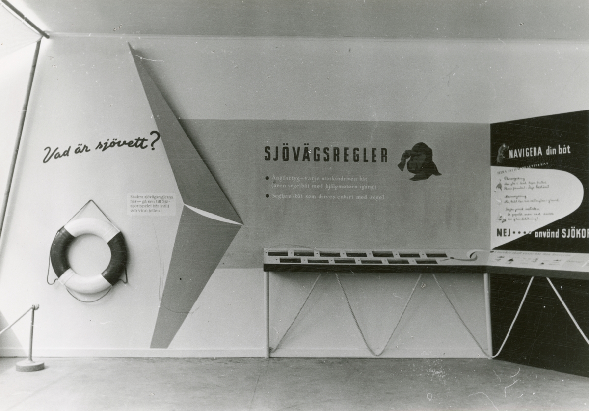 Tillfälliga utställningen, Sjösportsutställningen i källarvåningen. Monter om sjövägsreglerna där man kan studera reglerna för att sedan gå vidare till sjöspotspelet och vinna en jolle..
