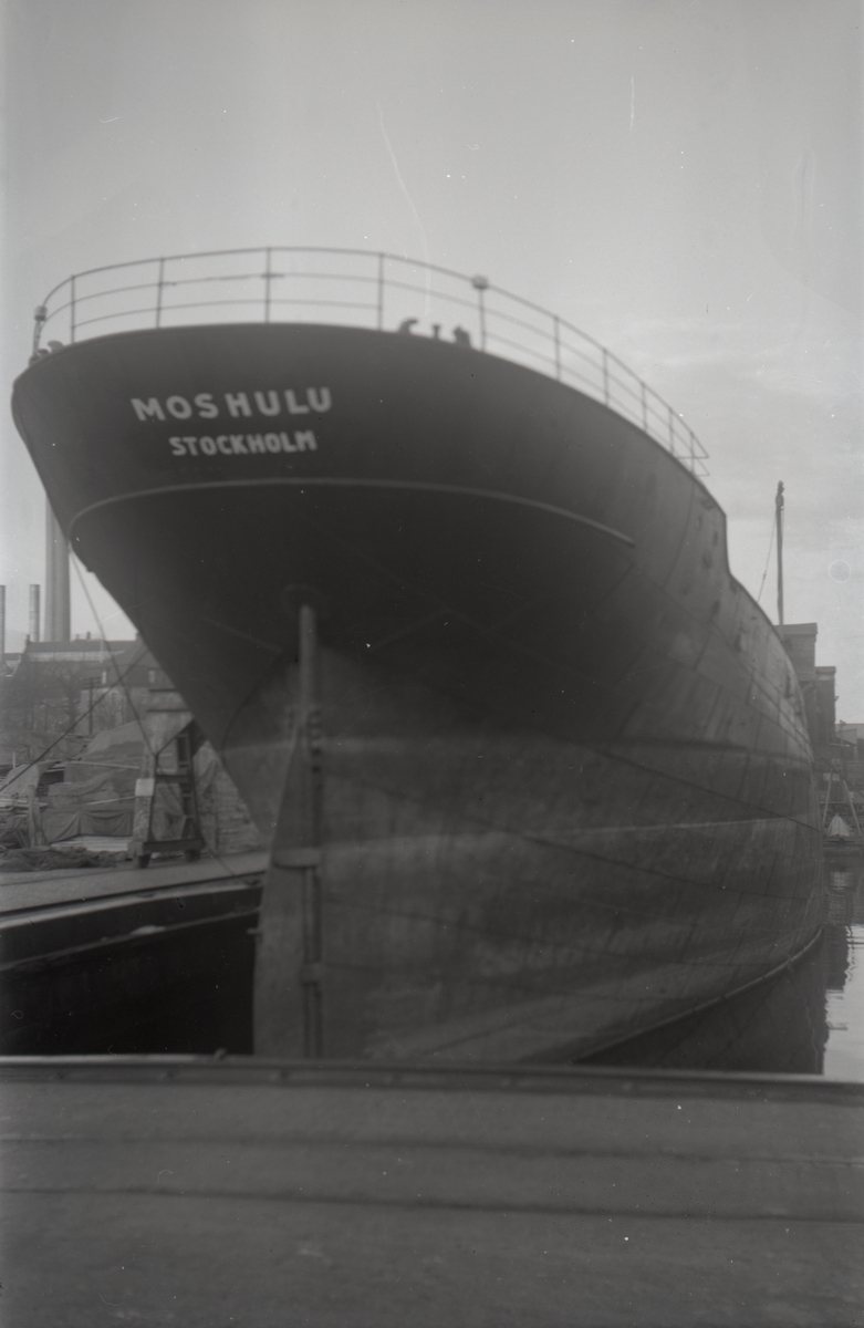 [från fotobeskrivningen:] [---] "F d 4-mastbarken MOSHULU avriggad som magasin (hulk) i Hammarbyhamnen, Stockholm 1948." [---]