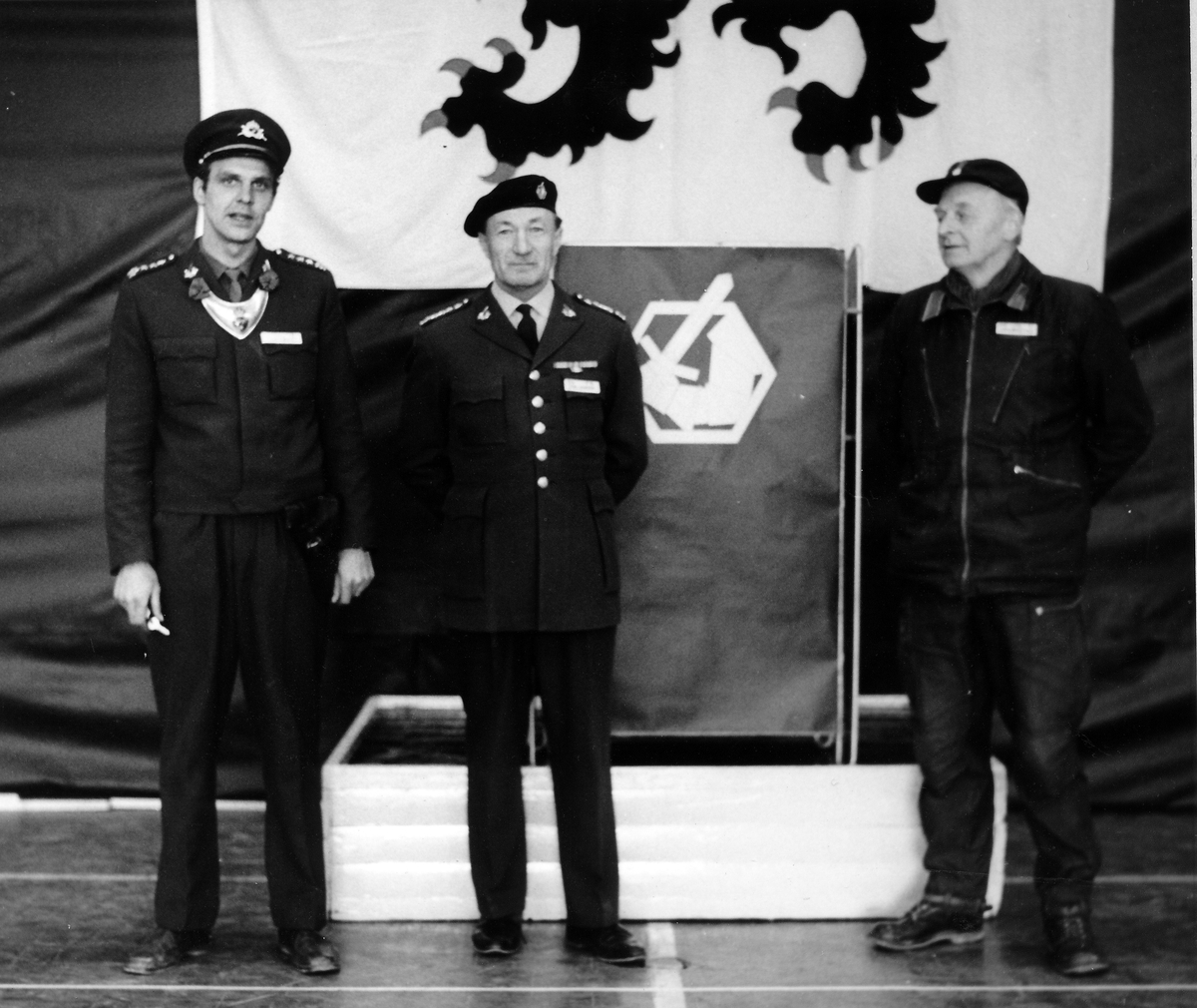 Bild tagen i samband med åldersklassens utryckning 1972-73, överste Stig Colliander flankeras av kapten Jaakko Bergqvist (dagofficer) och löjtnant Nils Jannerstad.