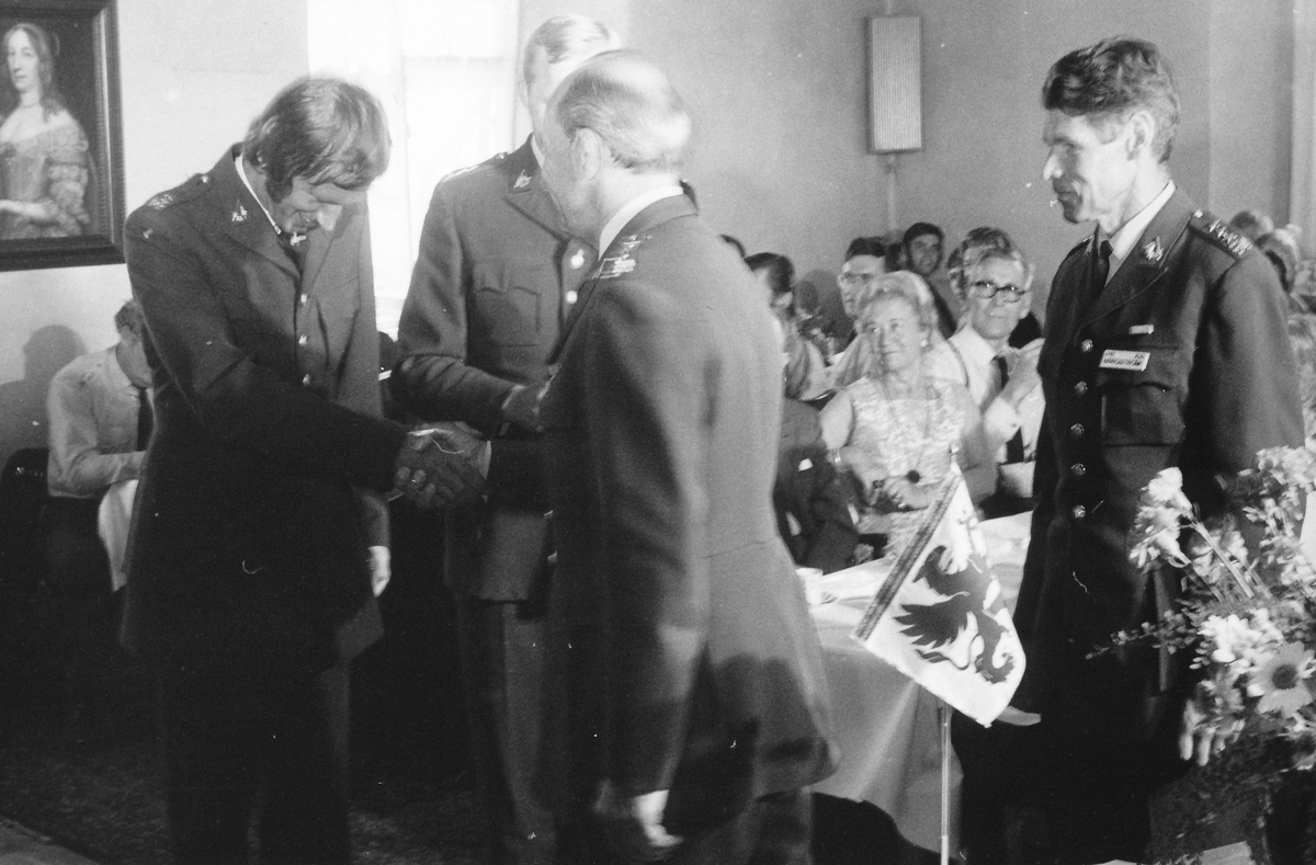 Fänrik Bernt Sandel och löjtnant Göran Dahlström tilldelas idrottspriser av regementschefen. Kapten Karl-Åke Bergström th.