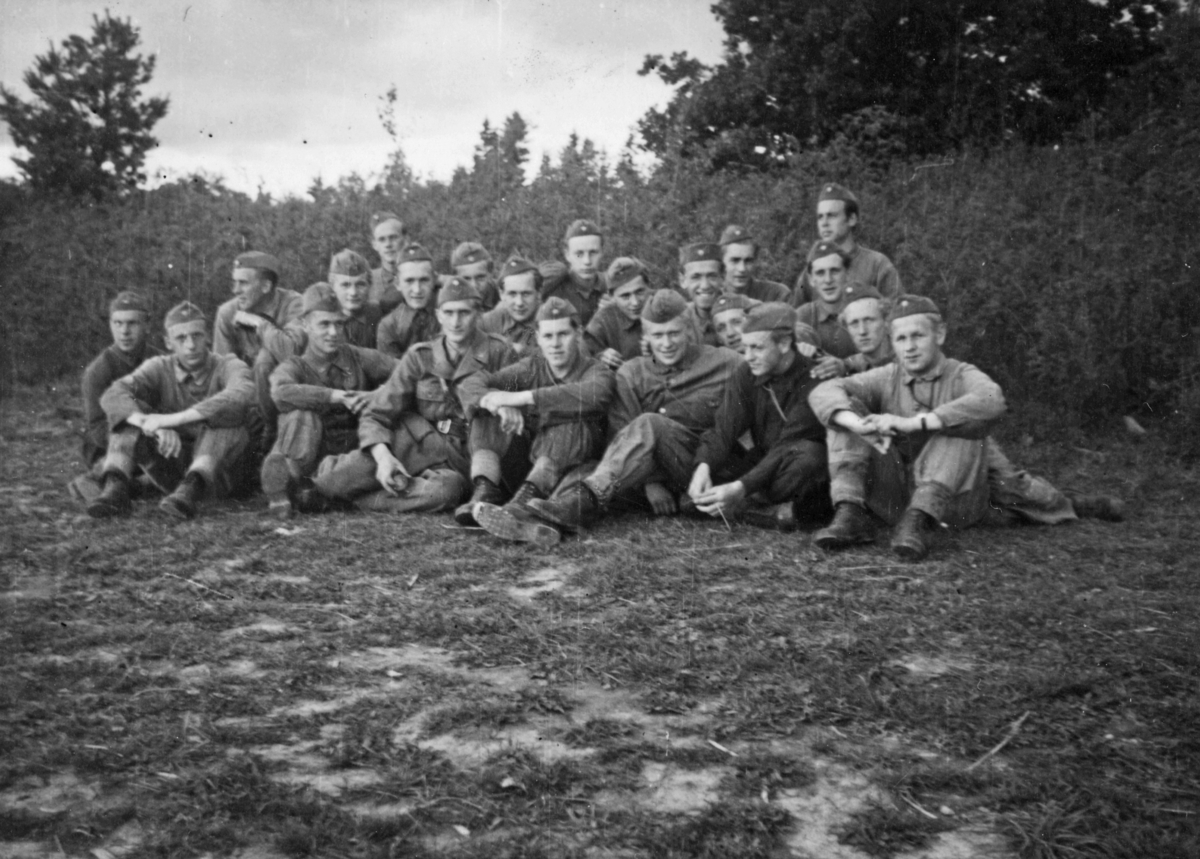 Titel: Arne Petterssons pluton sitter på Kasgarängen utanför regementet i Strängnäs.