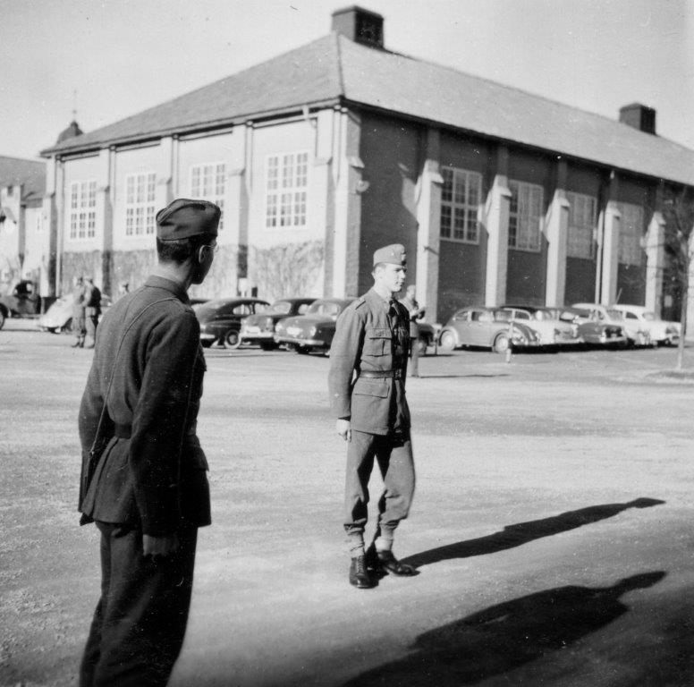 Befälseleverna övar trupputbildning, här kontrolleras "utbildningsmål". Korpral Gussing, med ryggen mot kameran, och Svensson.