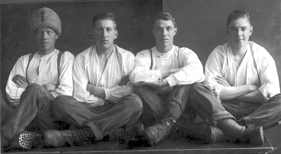 En grupp soldater poserar för fotografen. Den andre från vänster är soldat David Eriksson från Årdala, Södermanland.