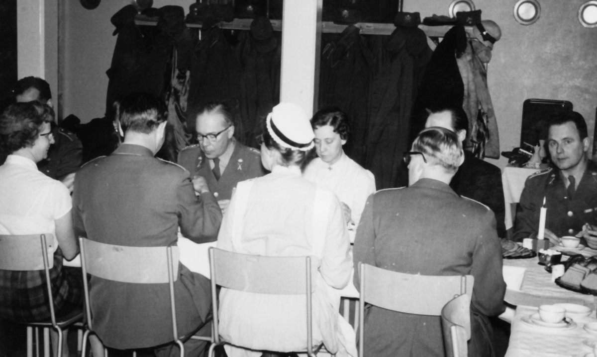 Regementschefen, överste Virgin, i mitten av bilden, vid hans sida sitter syster Inez, en sköterska av den gamla stammen. Längst till h. major Carl-Fredrik "Figge" Follin.