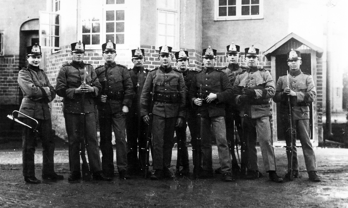 Kasernvakten uppställd vid grind 1 framför vaktbyggnaden (by 8).