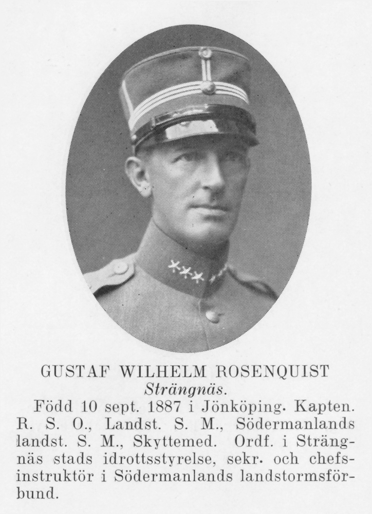 Titel: Strängnäs 1934 Kapten Gustaf Wilhelm Rosenquist Född: 1887-09-10 Jönköping Död: 1961-12-22 Västerås