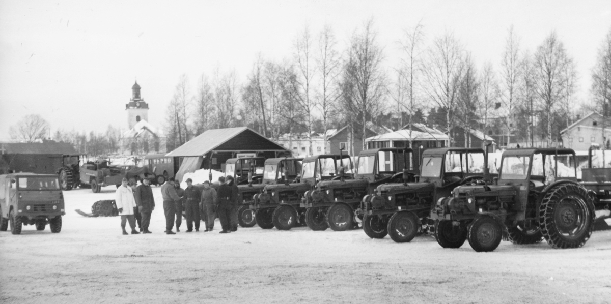 Titel: Sveg 1979. Hjultraktorkurs samlad på övningsplan. Svegs kyrka i bakgrunden. OBS! två bilder.