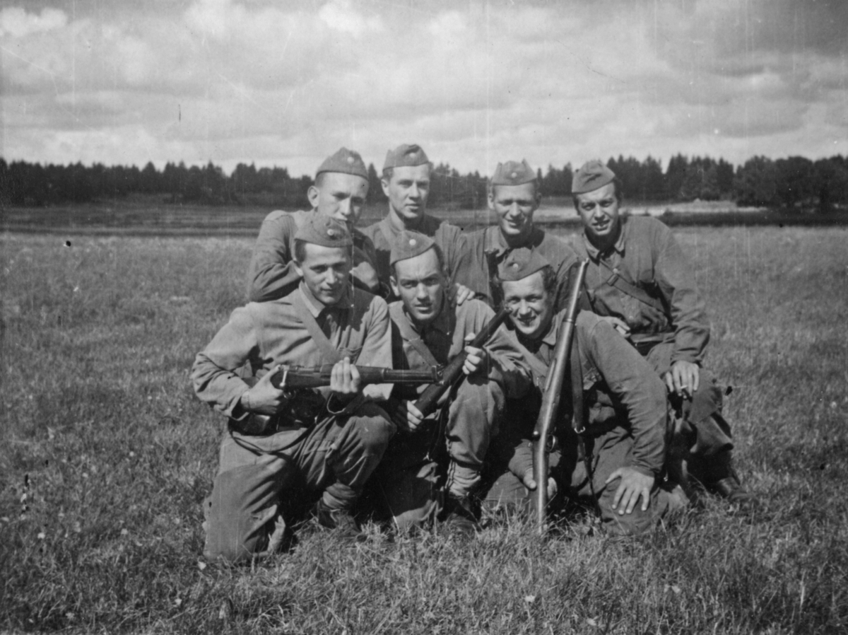 Titel: Under övning på P 3 övningsfält Lötgärdet. Okt 1944. Arne Pettersson längst till höger.