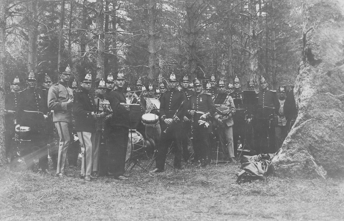 Musikkåren iklädd modell ä, i skogsterräng, 1920-1930-talet