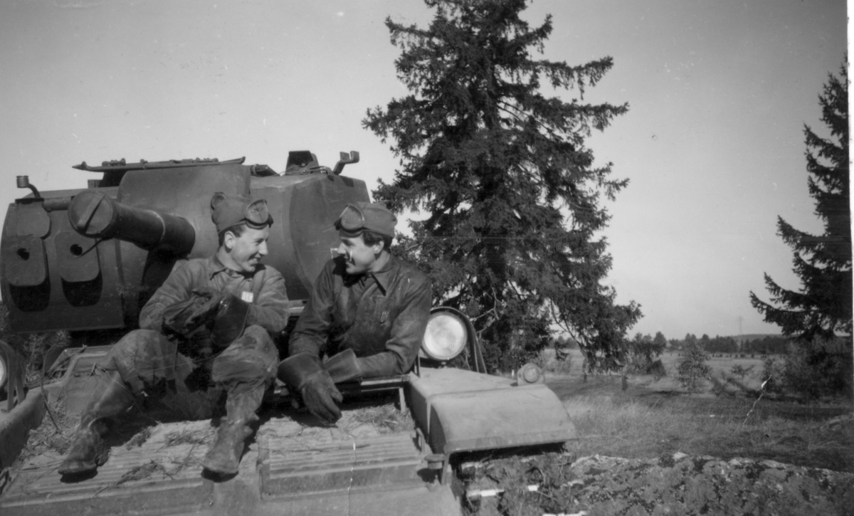 Titel: Stridsvagnstjänst på P 3 övningsfält i Strängnäs. På stridsvagnen sitter furir Wallgren och Ohlström.