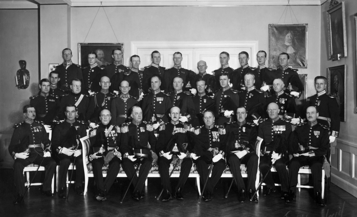 C F Lindvall, Sven Almqvist, bataljonsläkaren, Gustaf Frithz, Thor Klintberg, K-H Parment, Hjalmar Odqvist, G Rosenqvist, Åke Svinhufvud, Per Erik Malmström, R R J von Essen och musikdirektören Victor Fritzell.