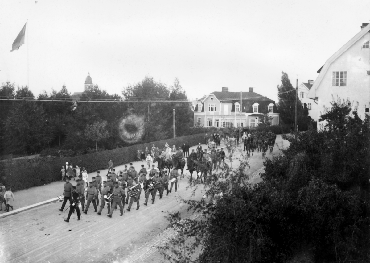 Bakom musikkåren rider fyra officerare, den kraftige i uniform m/Ä är kapten Nordenskjöld.
