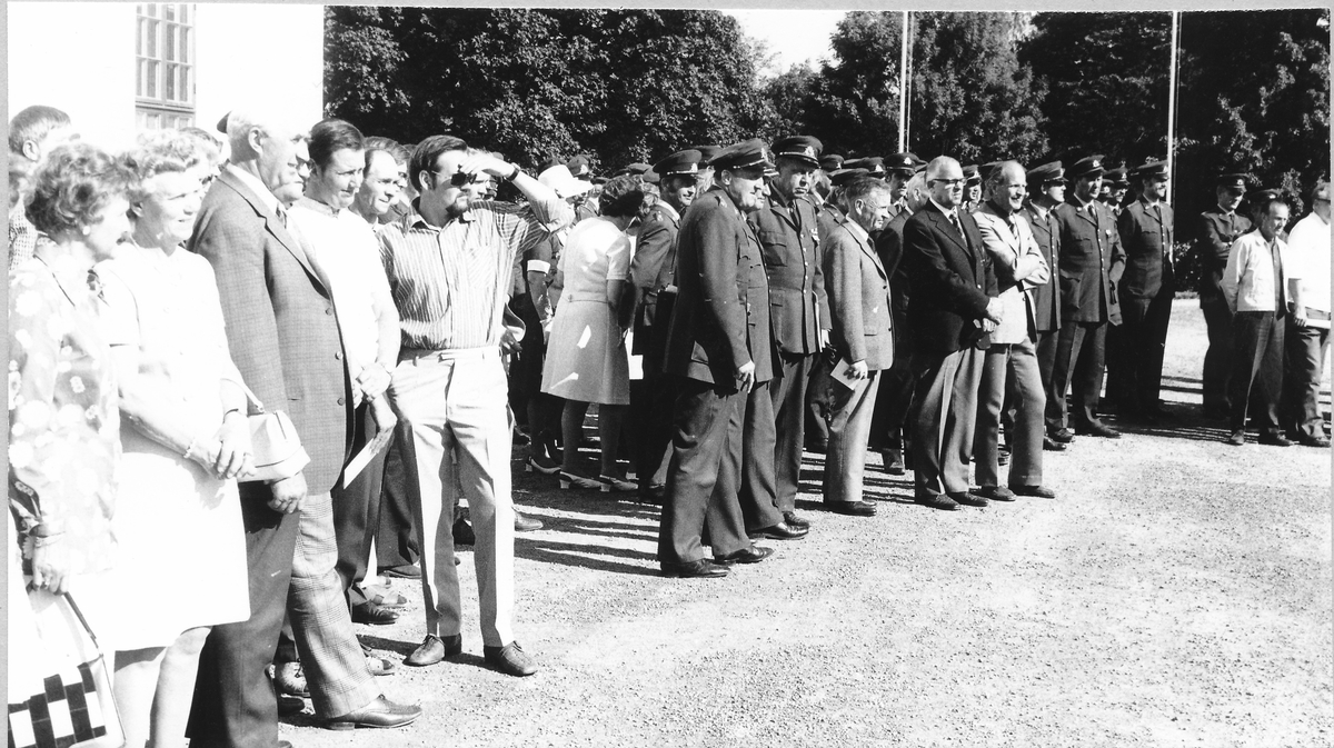 I uniform från v; fj Curt Harg, kn Erik Lundkvist, delvis dold öv Stig Colliander och mj Nils-Henrik Moberg.