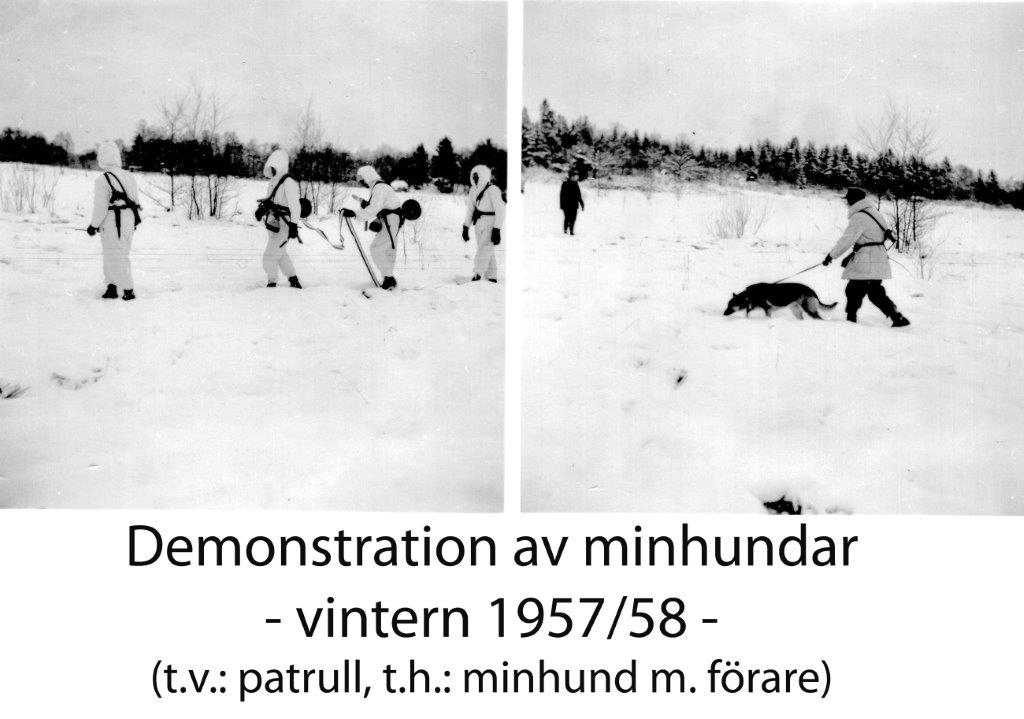 Demonstration av minhundar, vintern 1957/58, i terrängen bortom Eldsundsån.