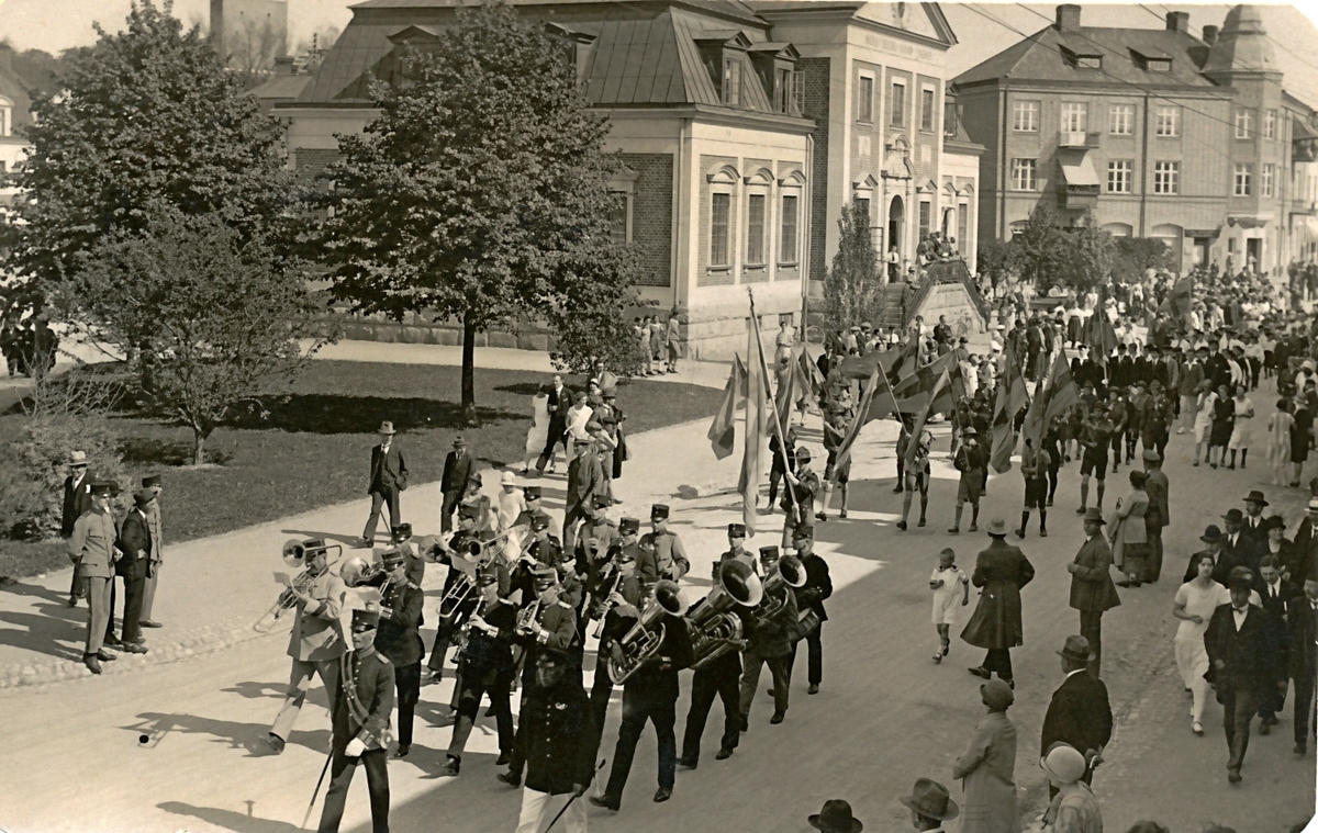 Regementets musikkår i täten för parad genom staden vid Svenska Flaggans dag.