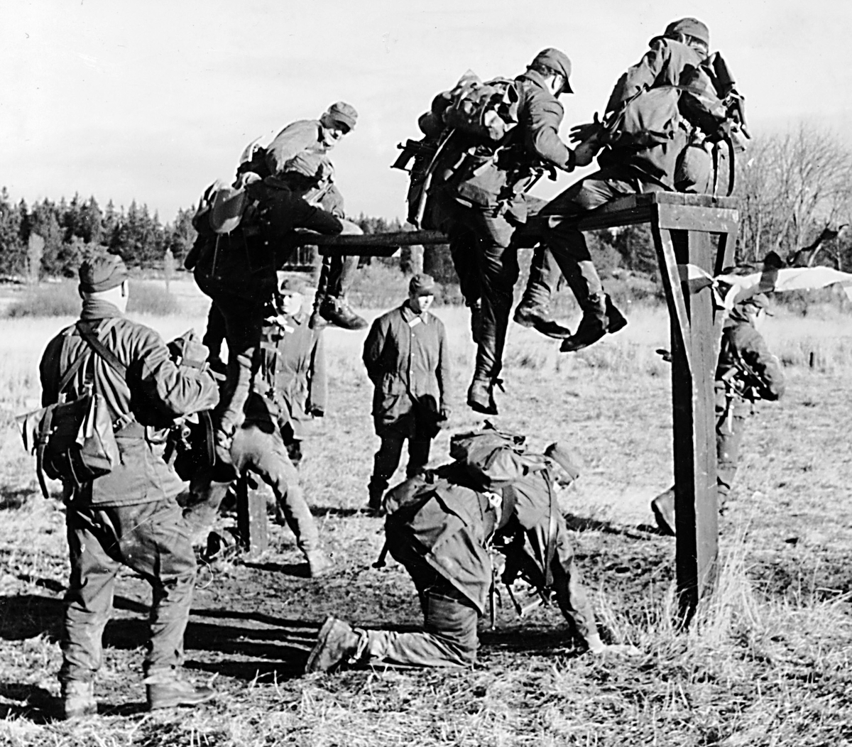 Motorcykelplutonen deltar i plutonsfälttävlan. Här passeras "Irländska bordet" på stora hinderbanan.
