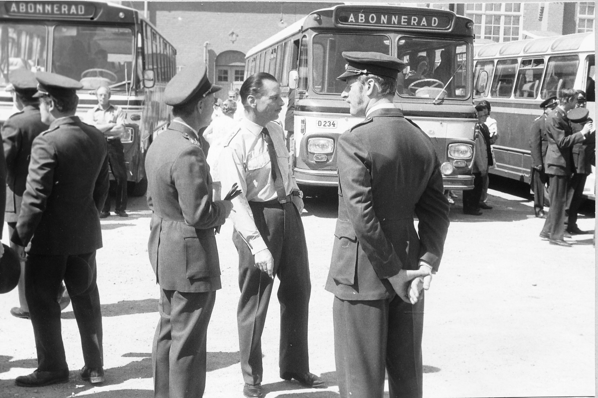 Tv med ryggen häråt fanjunkare Ulf Larsson, med mössan på svaj major Jan Forsman. I skjorta kapten Alf Gustafsson och med stiliga polisonger fanjunkare Hasse Bendeby.