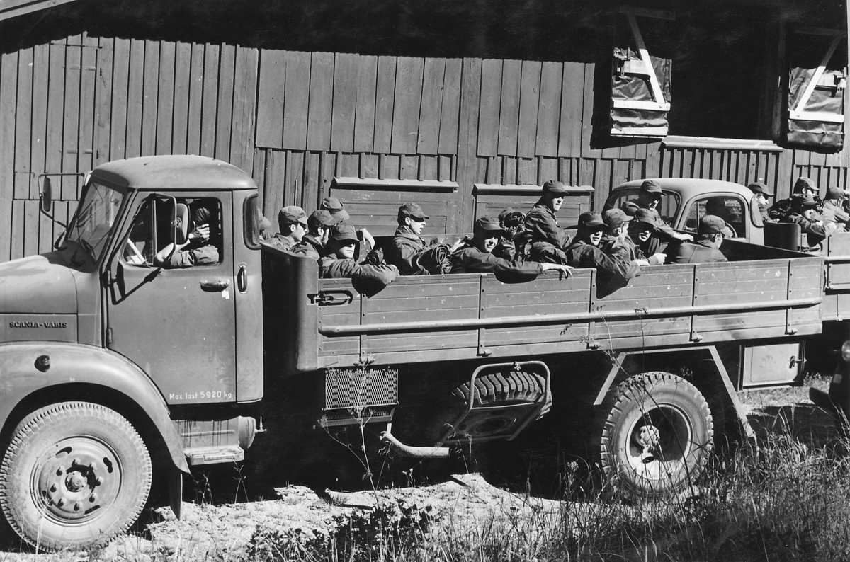 Titel: Förflyttning P 10 Strängnäs - Skarpnäck Stockholm Truppen upplastad på Scania Vabis L 36.