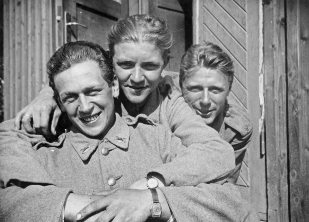 Titel: Vakttjänst vid Grävarbacken Kasgaren 5 aug 1944. Arne Pettersson med två kompisar.
