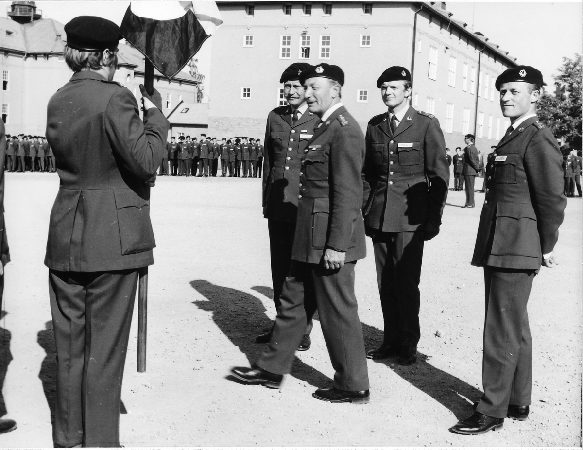 Till vänster 3. kompaniets standarförare, sergeant Christer Blomlöf, överste Stig Colliander, löjtnant Hans Norlén och bataljonchefen major Torsten Björkeroth.