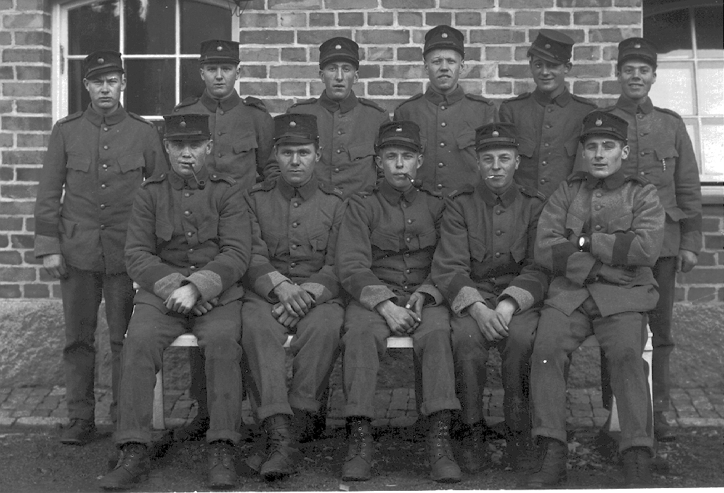 En grupp soldater poserar för fotografen. I den bakre raden, tredje från vänster, står soldat David Eriksson från Årdala, Södermanland.
