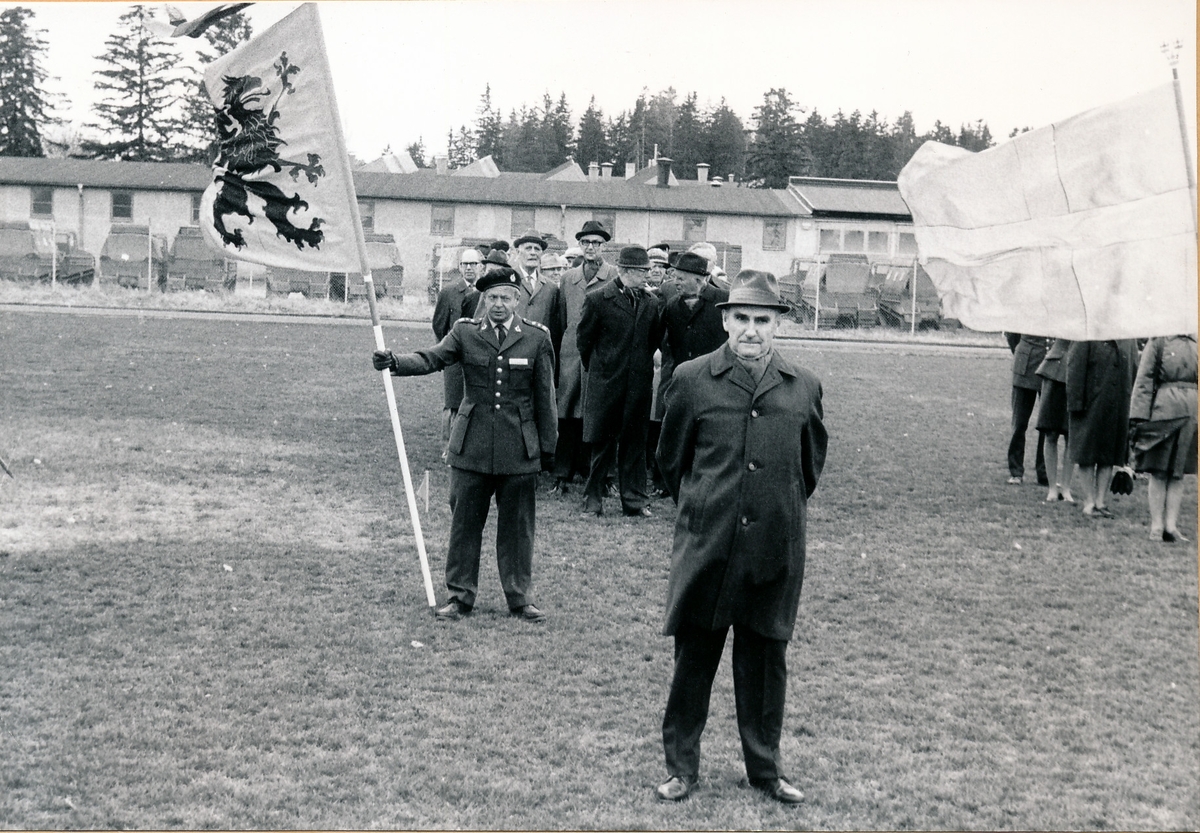 Kungliga Södermanlands regementes kamratförening uppställda med ordförande fd regementschefen överste Gunnar Henricson i täten. Fanförare är major Jan Forsman.