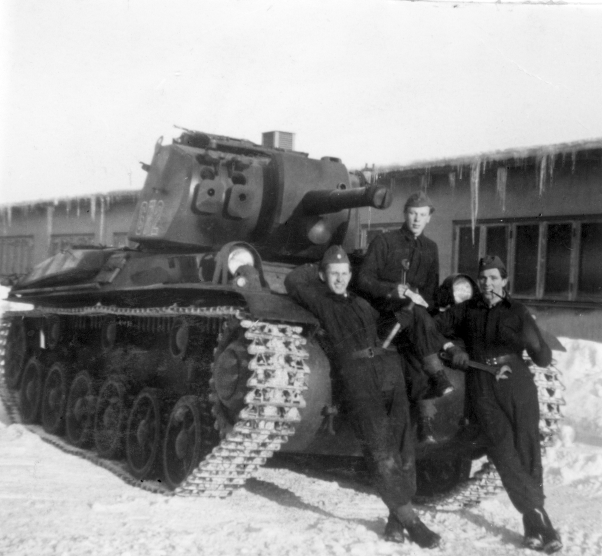 Titel: Tre korpralskoleelever framför en stridsvagn på P 4 garageplan. Milregnr: 672