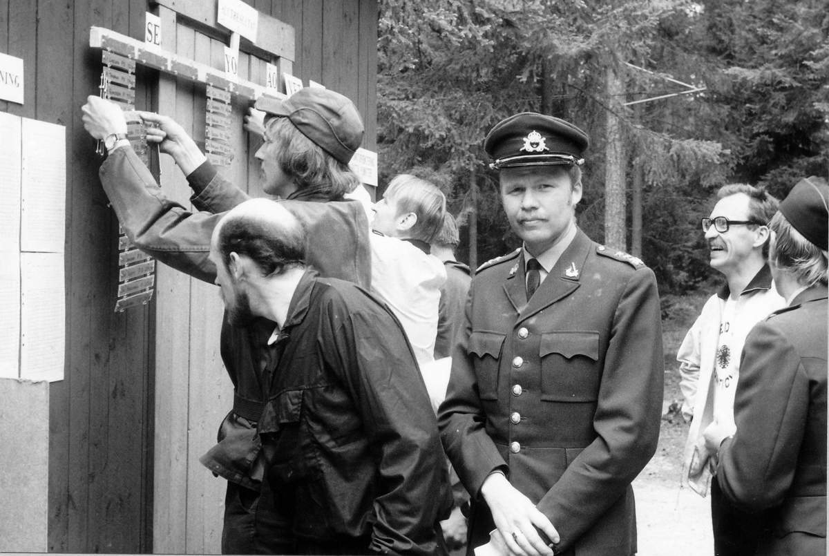 Granskar och begrundar tävlingsresultat gör frv fanjunkare Gösta Håkansson (P 1), fanjunkare Arne Granath, redan ombytte kaptenen Göran Dahlström och majoren Bill Nyman.