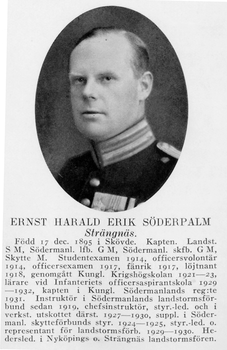 Titel: Strängnäs 1934 Kapten Ernst Harald Erik Söderpalm Född: 1895-12-17 Skövde Död: 1955-02-26 Skövde