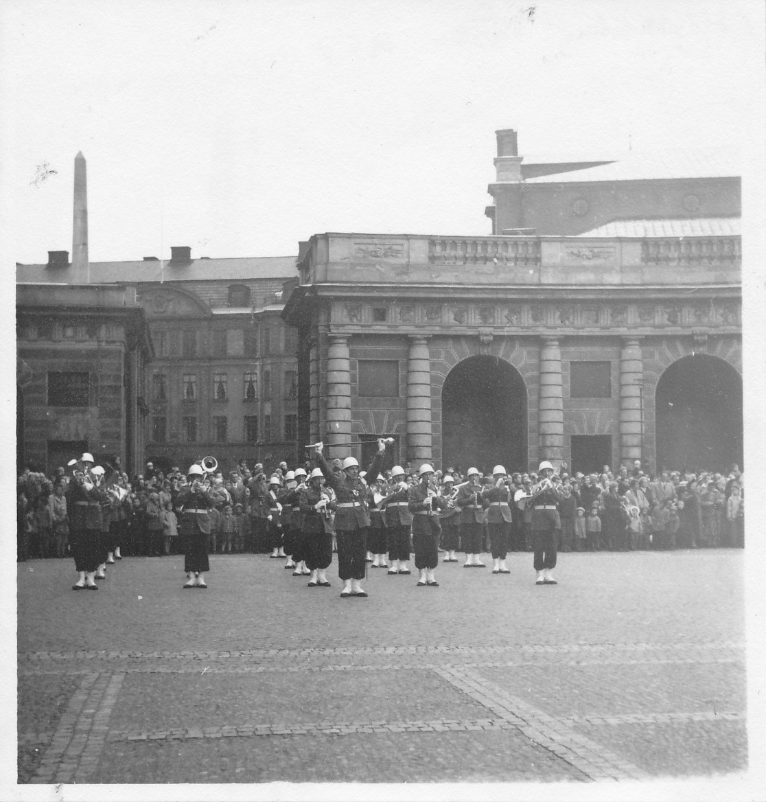 Musikkåren går högvakt på Stockholms slott hösten 1957. Regementstrumslagare och tamburmajor är Erik Lundin (1908-1982).