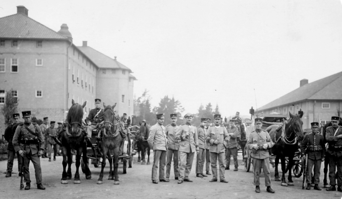 Bakom ser vi kasern 6 och matsalen (by 9). I bortre delen av kasern 6 låg regementets sjukhus.