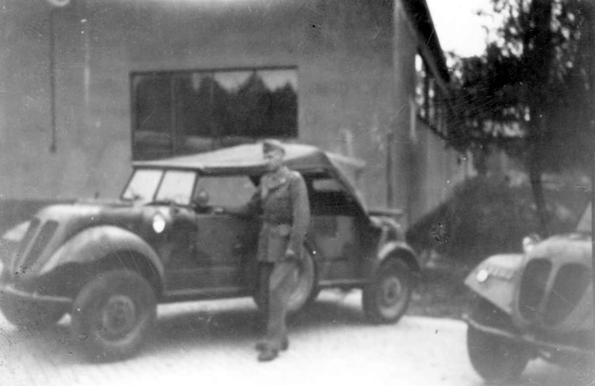 Volontär 118 Ericsson vid en tysk terrängbil en så kallad "Tempo jeep" på garageplan under regementets dag 1947.