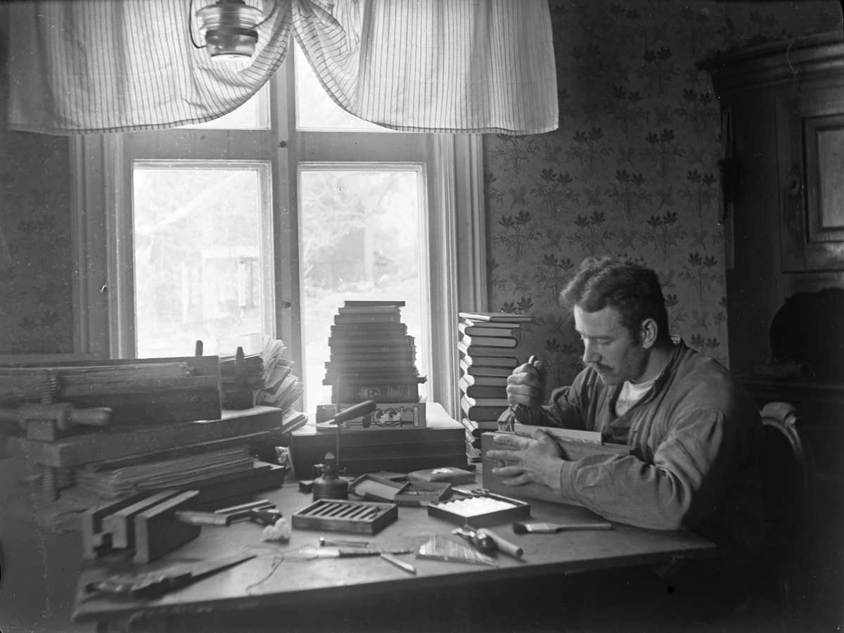 Uppland, Breds socken, Hamby. "Interiör fr. Bokbindarverkstaden". Karl Wallin i sitt föräldrahem. Fotot är troligen taget 1911.