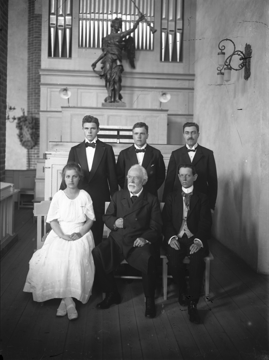 Fem män och en kvinna poserande framför en orgel, i kyrka troligen