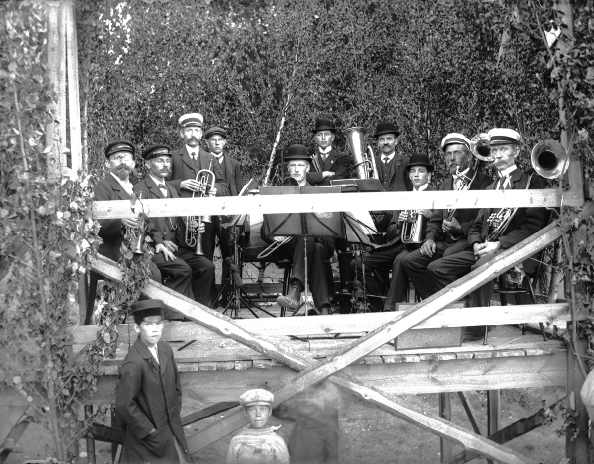 Musikkår, oidentifierad, sittande på en hög utomhusscen omgiven av björkar.