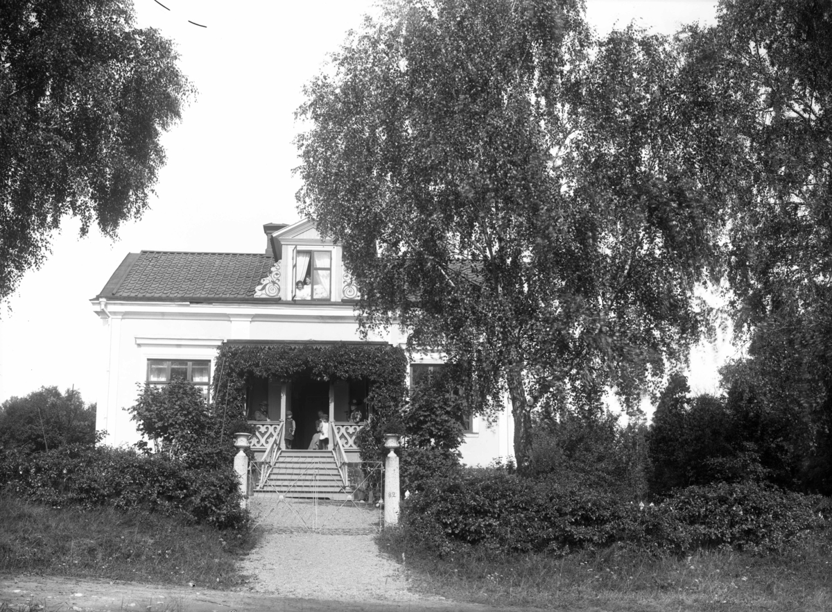 Oidentifierat hus med personer på veranda och övervåning. Grindstolpar märkta "1882". Foto troligen taget 20 augusti 1907.
