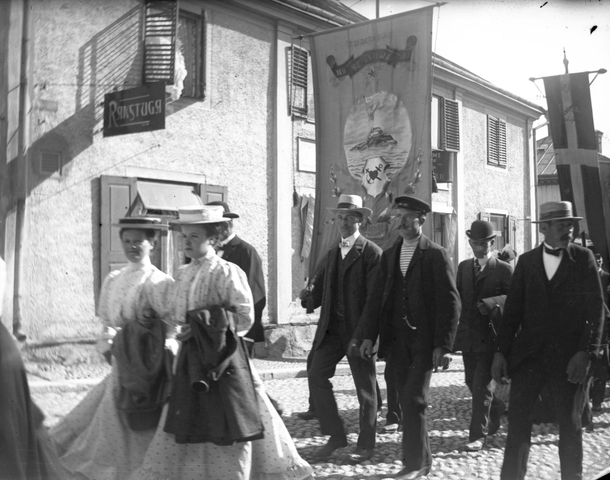 "1 maj, Kungsgatan, Apotekarbacken". Vid Kungsgatan 15, Enköping, sett från norr.