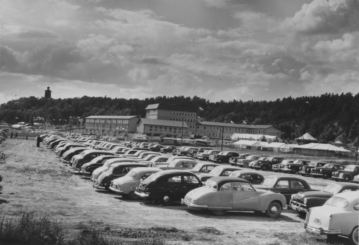 Enköping, Korsängsskolan, Enköpingsutställningen 1955, bilparkeringen med Vårfrukyrkan i bakgrunden