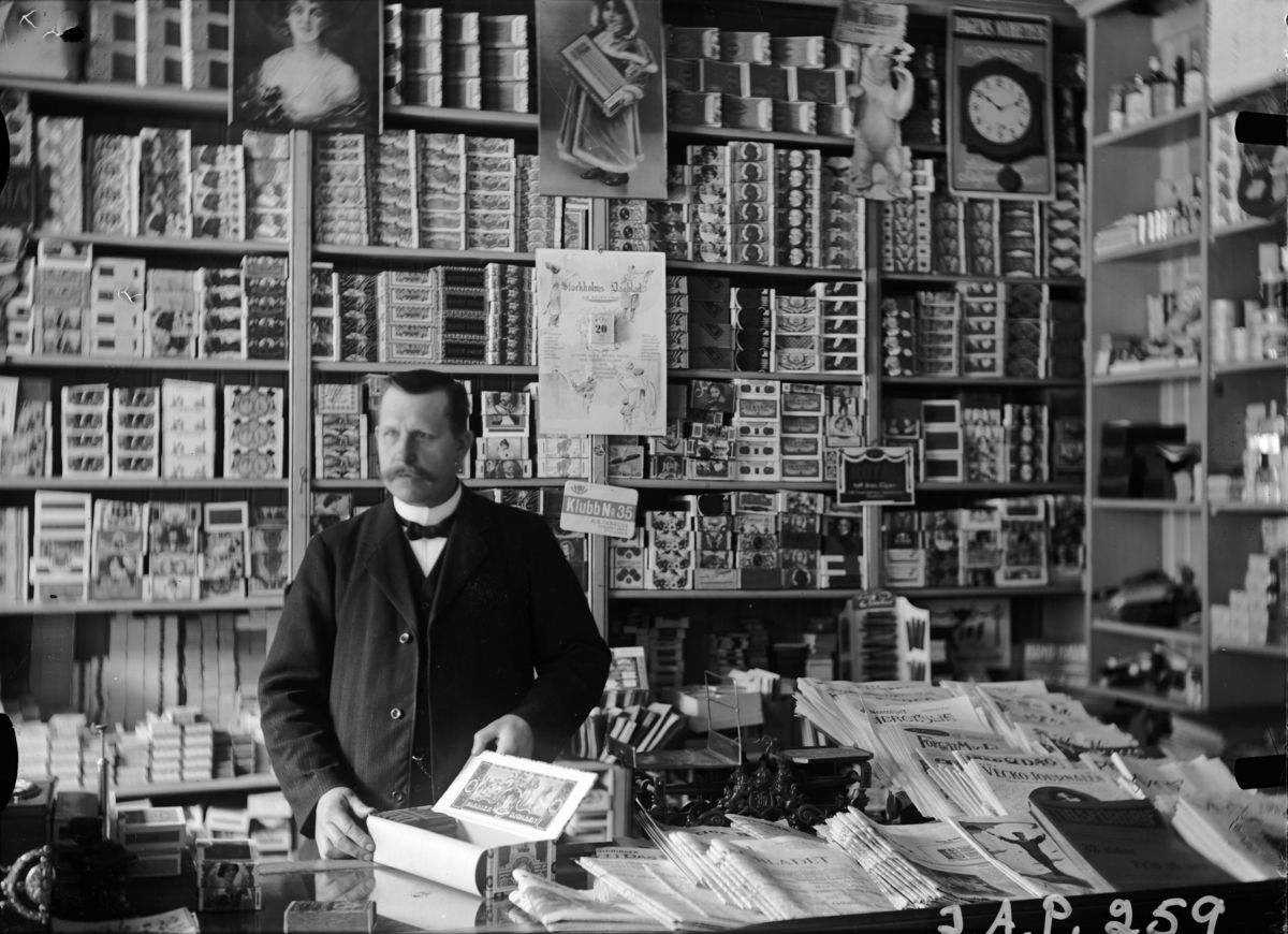 Johan August Pettersson inne i Enköpings Cigarr- & Tobakshandel, Kungsgatan 16, Enköping