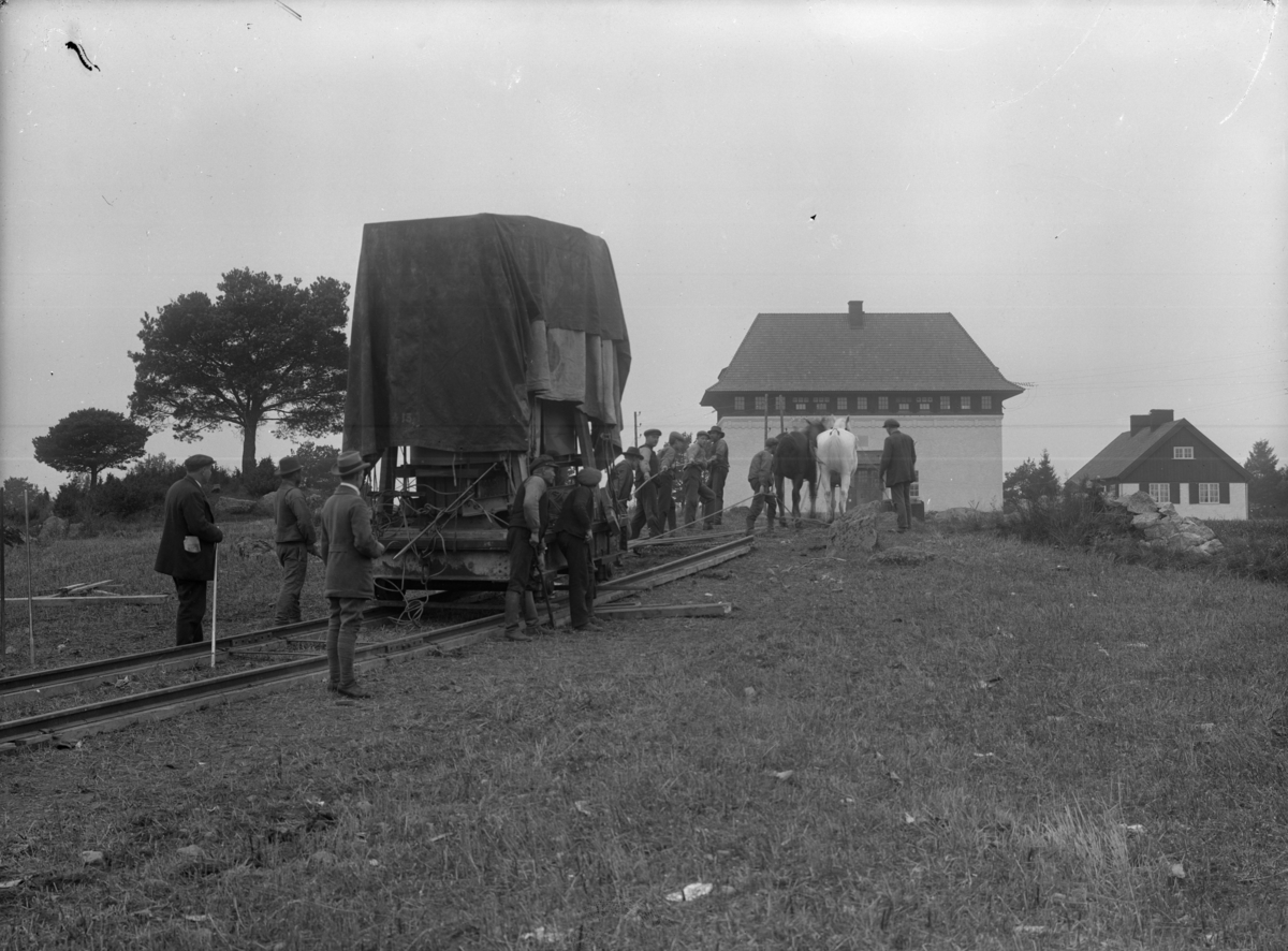 Transport av transformator till Enköpings kraftstation, 1915. Vy från nuvarande Kabelgatan, Enköping, mot väster.
