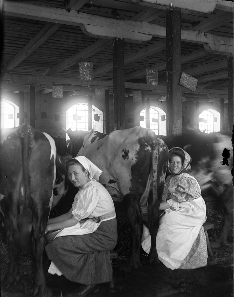 Uppland, Breds socken. "Mjölkflickor i Eklunda ladugård". Fotot är taget den 28 maj 1909 klockan 12.