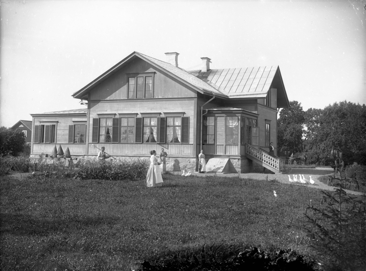Rekasta No. 3 (nuvarande adress Rekasta 13), Vårfrukyrka socken, Uppland, troligen 31 augusti 1897. På trappan Agnes Karolina Larson född Forsberg (1848-1930), fru till ägare grosshandlare Adler Larsson (1832-1919) Stockholm.