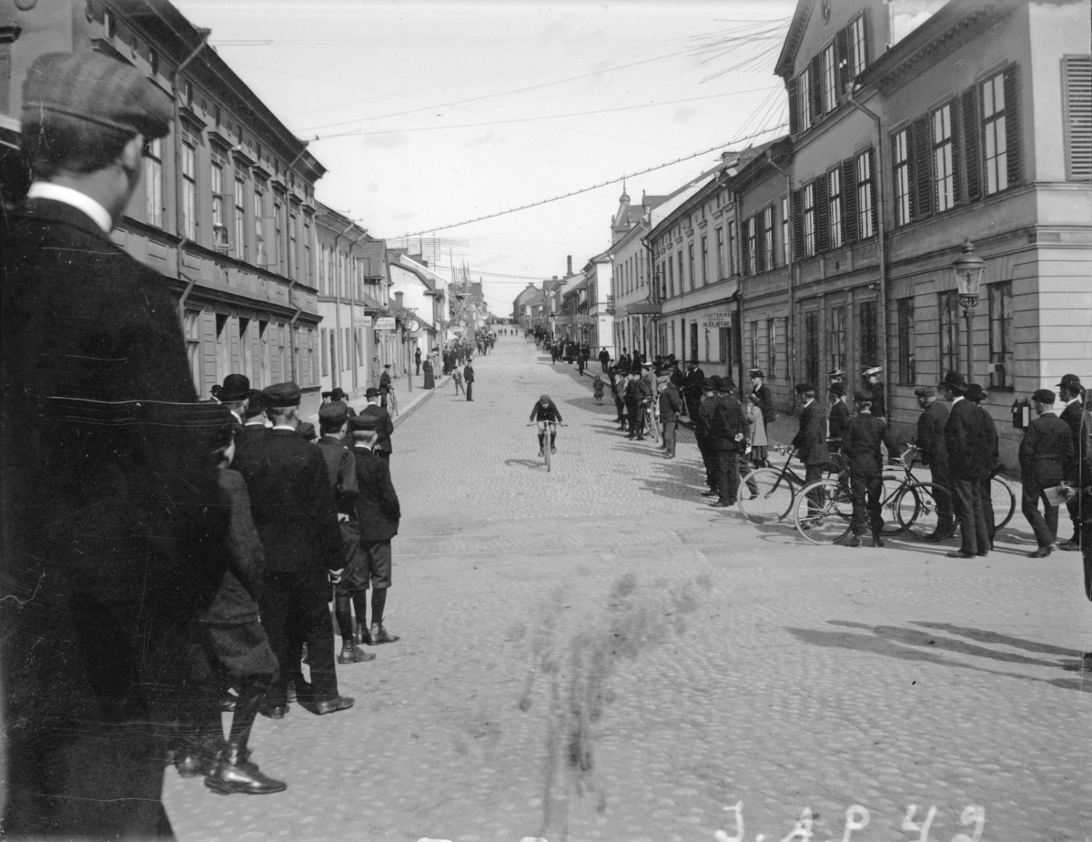 "Mälaren runt". Cyklist färdandes nedför Kungsgatan, sett nedifrån Ågatan, Enköping.