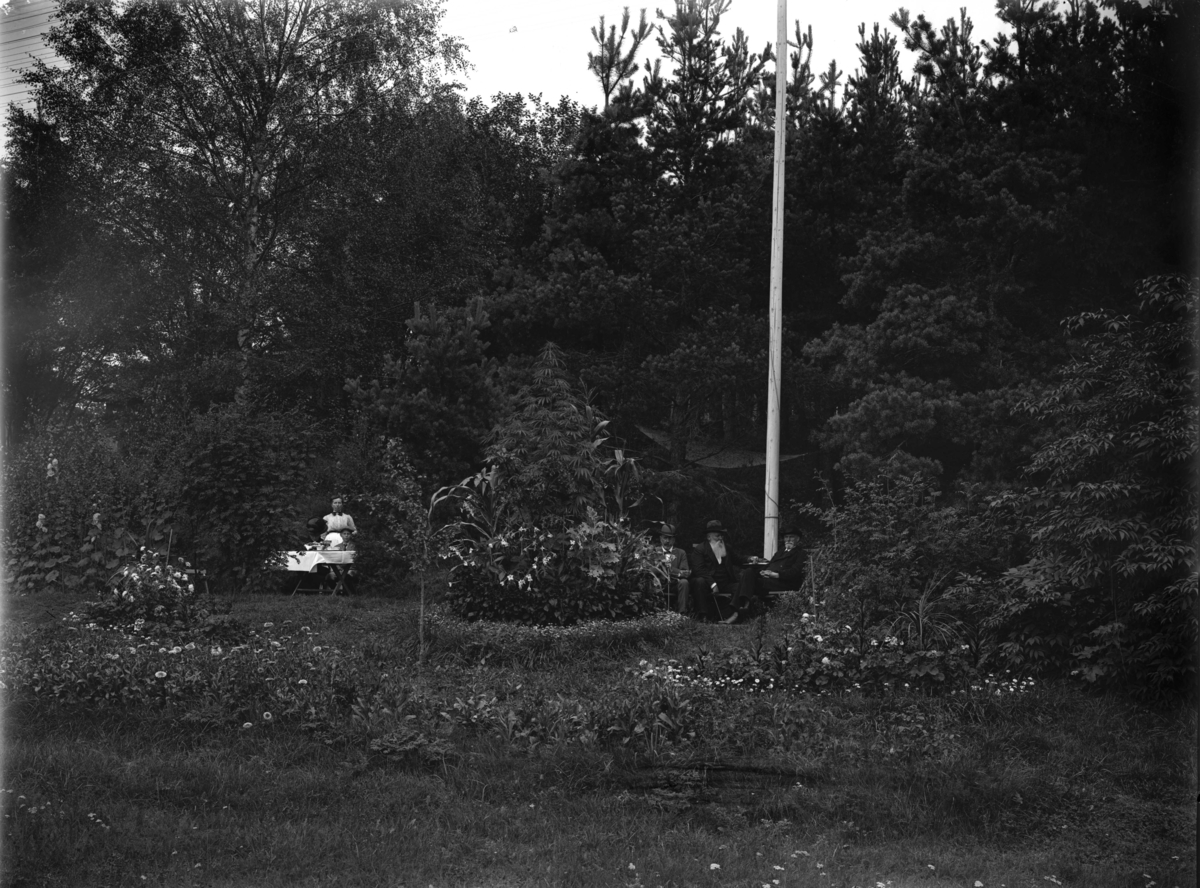 Tre män, två kvinnor och en pojke sittande vid bord i trädgård