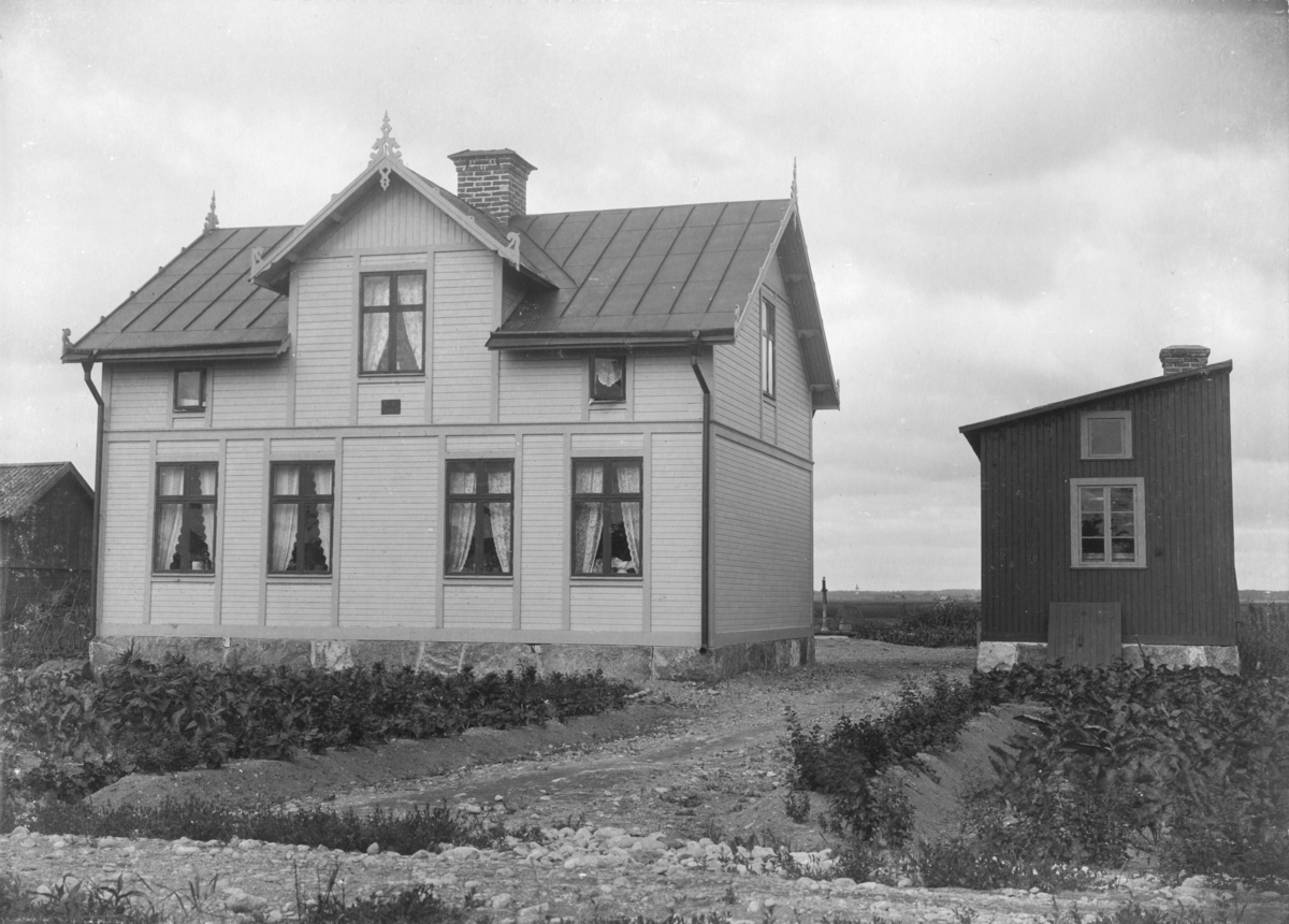 Sannolikt järnarbetare E. A. Johanssons (1868-1918) gård, Hägnadsvägen 8, Enköping, vy från öster, tidigast 1898.