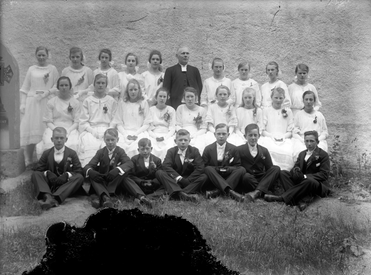 Konfirmandgrupp, sannolikt vid Vallby kyrka (östra gaveln), Uppland. I mitten sannolikt kyrkoherde Gustaf Thegerström (1853-1937).