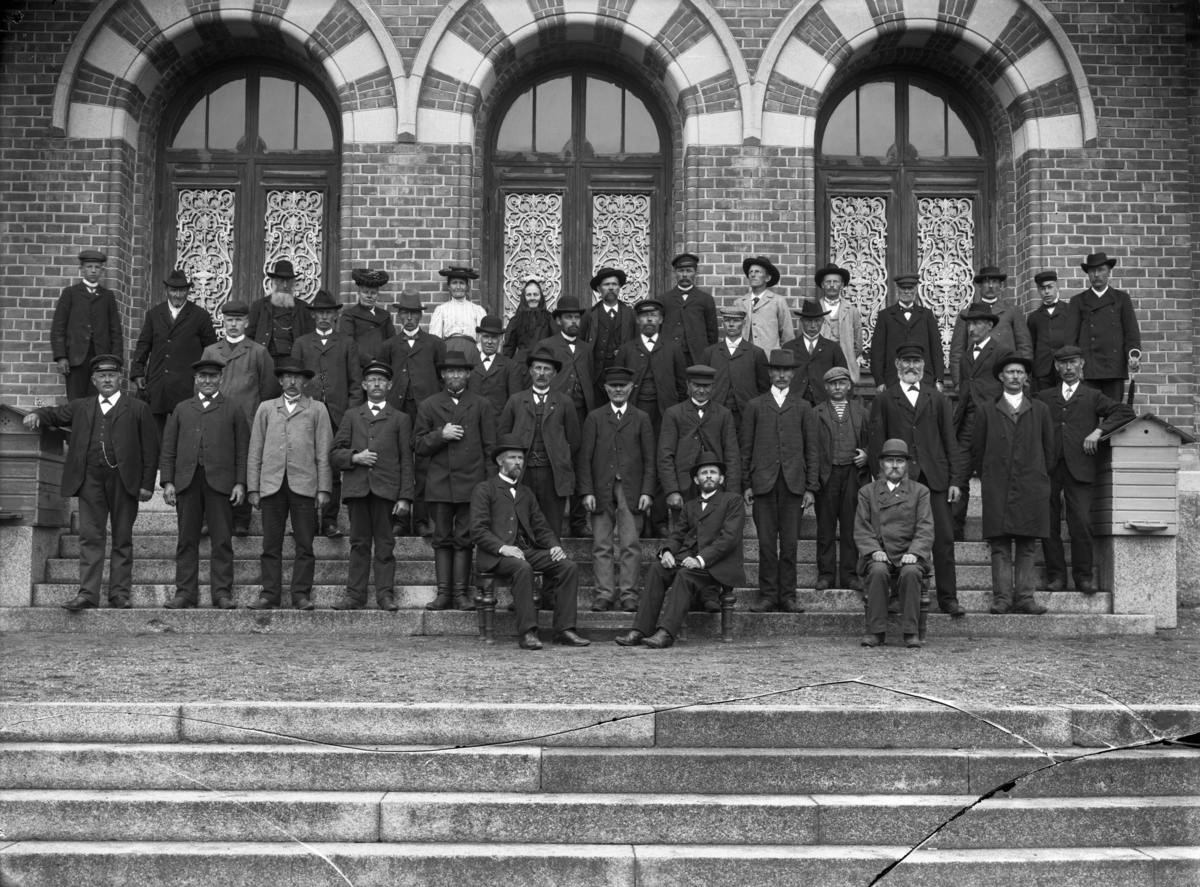 Grupp på trappan till tingshuset, Kyrkogatan 4 (Tullgatan 18), Enköping, vy från sydväst