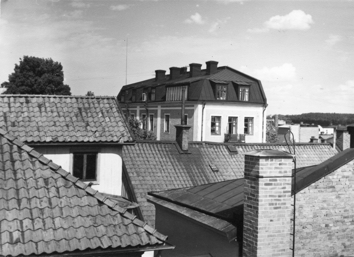 Enköping, kvarteret Apotekaren nr 4 (3 ½-plansbygge), sedd över taken i kvarteret Bagaren, mot öster