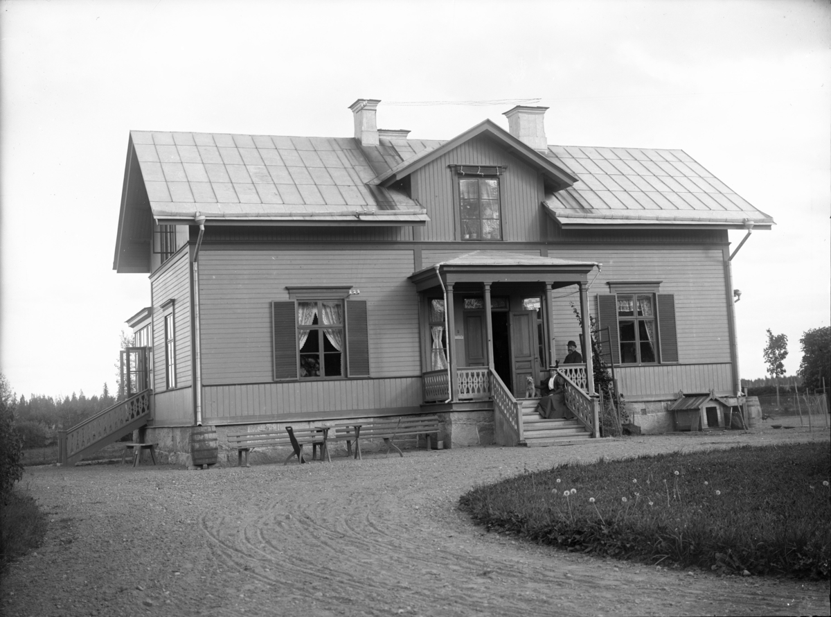 Rekasta No. 3 (nuvarande adress Rekasta 13), Vårfrukyrka socken, Uppland, troligen 30 augusti 1897. På verandan ägaren grosshandlare Adler Larson (1832-1919) Stockholm med fru Agnes Karolina Forsberg (1848-1930).